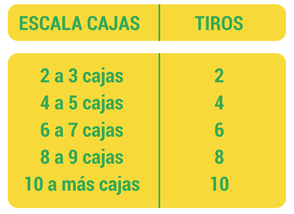 4. La cantidad de tiros disponibles para participar, está definido según la cantidad de cajas Mas que hayas comprado en la factura ingresada. Aquí te mostramos la escala de tiros: