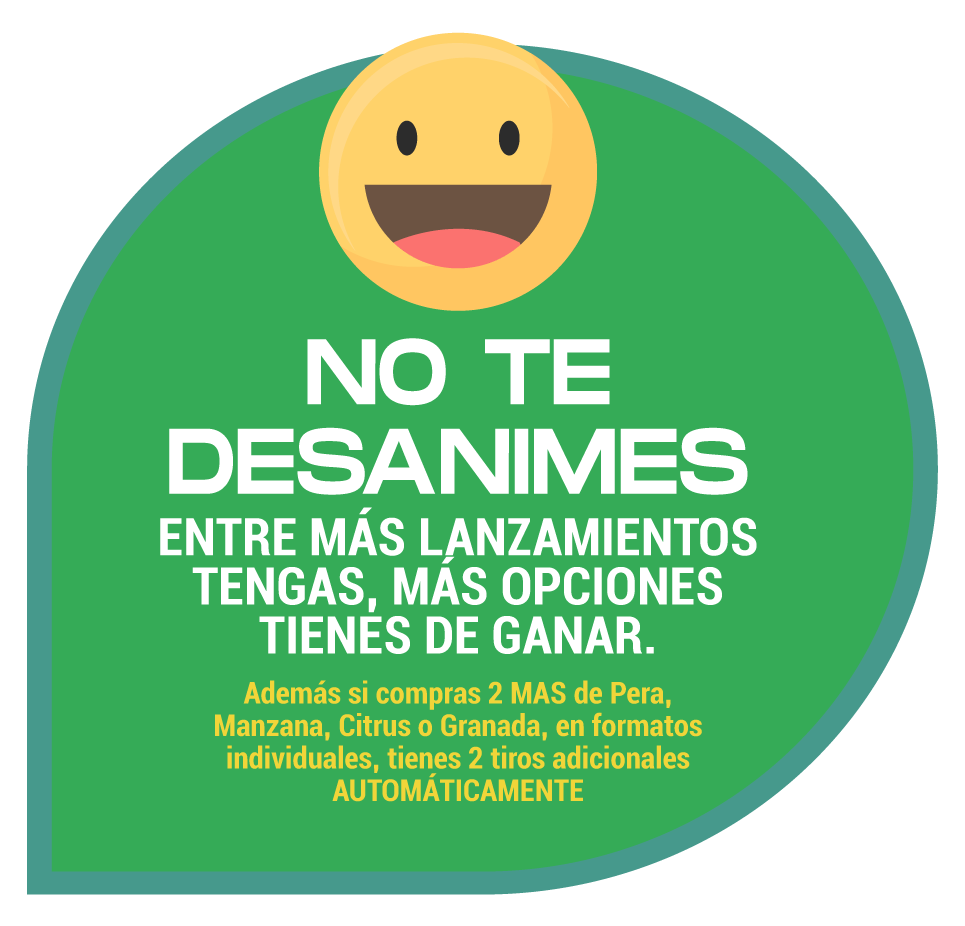 Importante: Si tu factura tiene al menos dos cajas de formato individual de alguno de los siguientes sabores: Manzana, Pera, Citrus y Granada, obtienes automáticamente 2 tiros adicionales a los definidos por la escala!